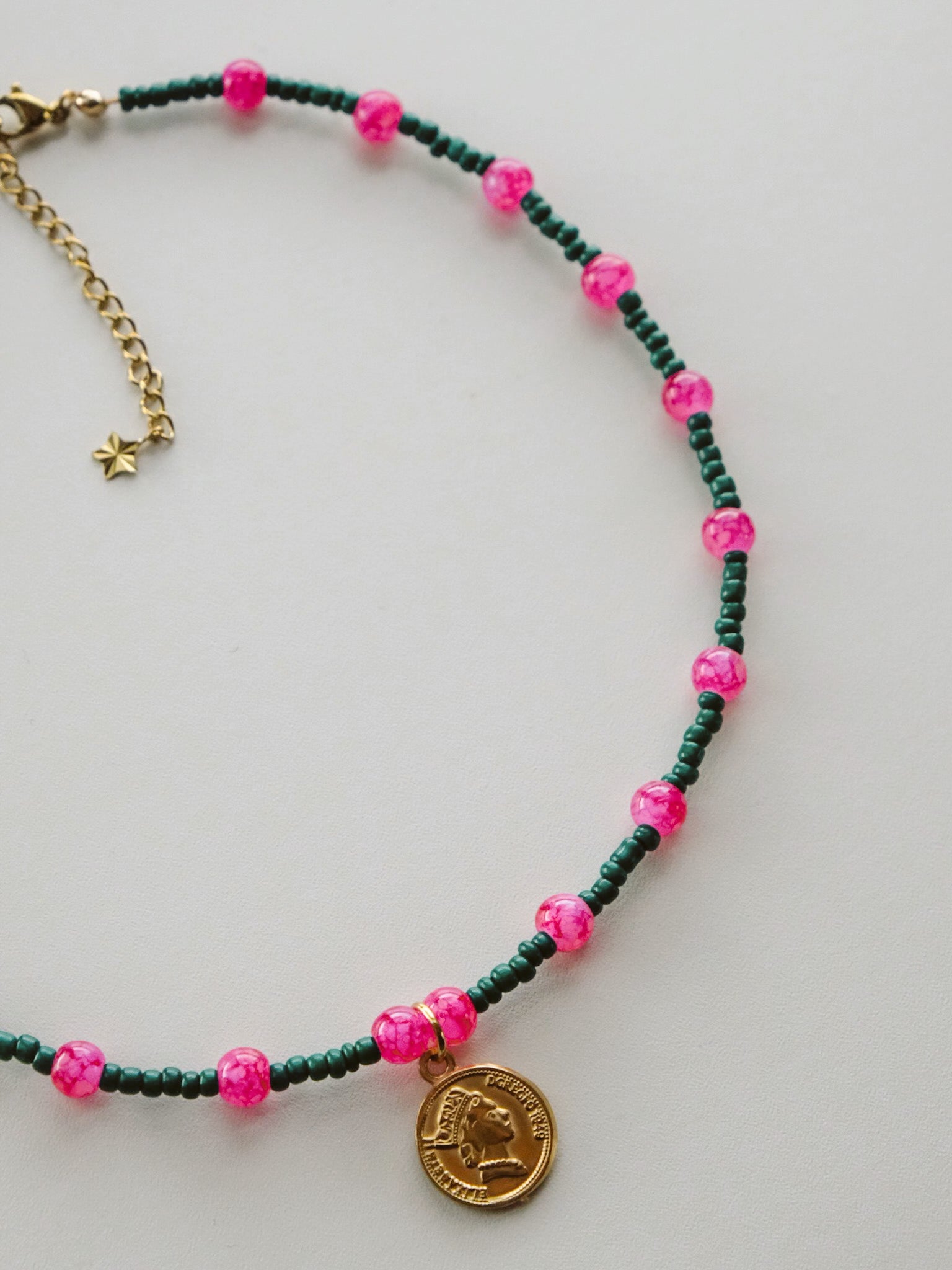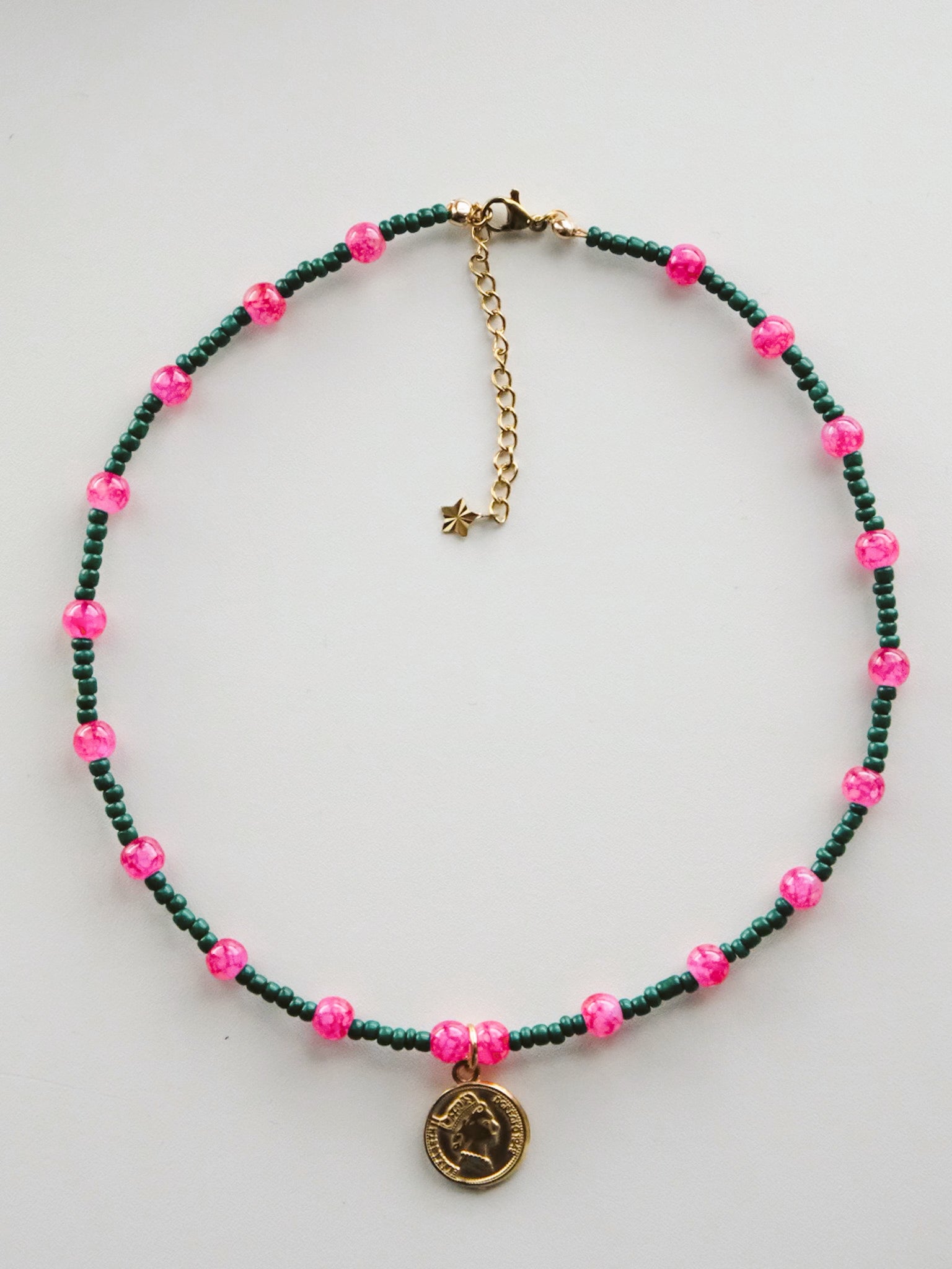 Coin Charm Ketting - Donkergroen/Roze