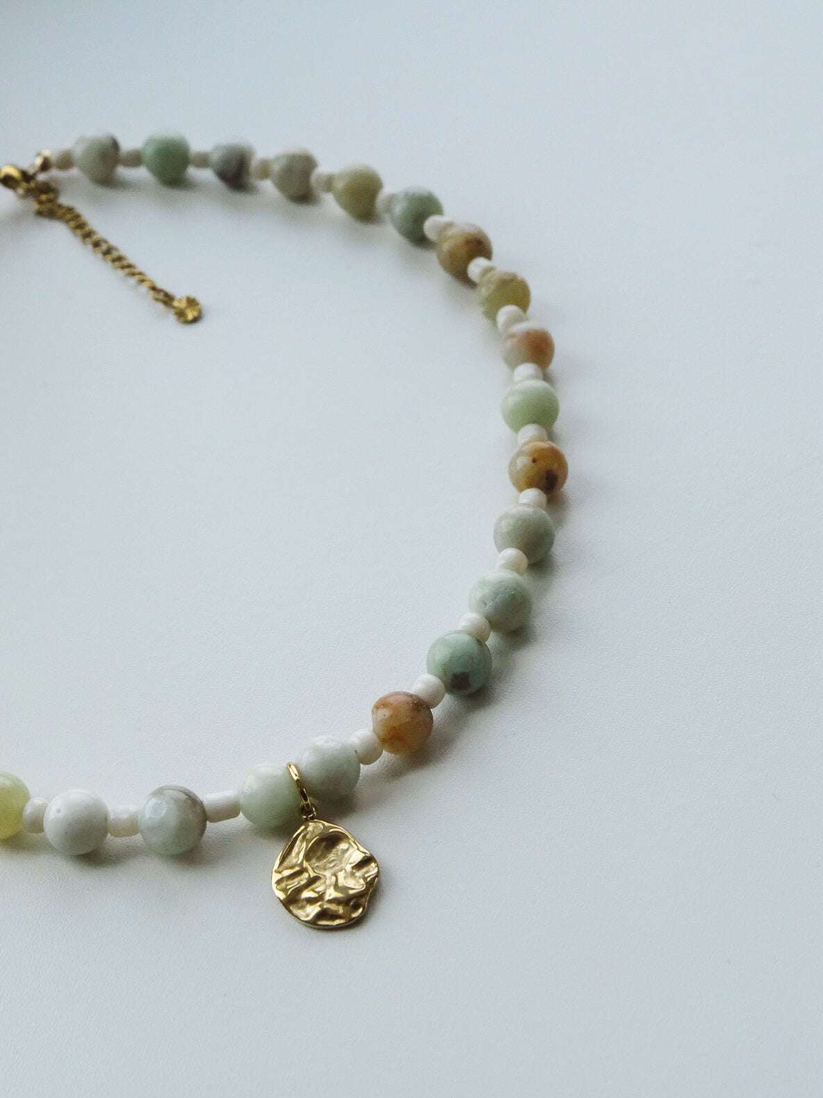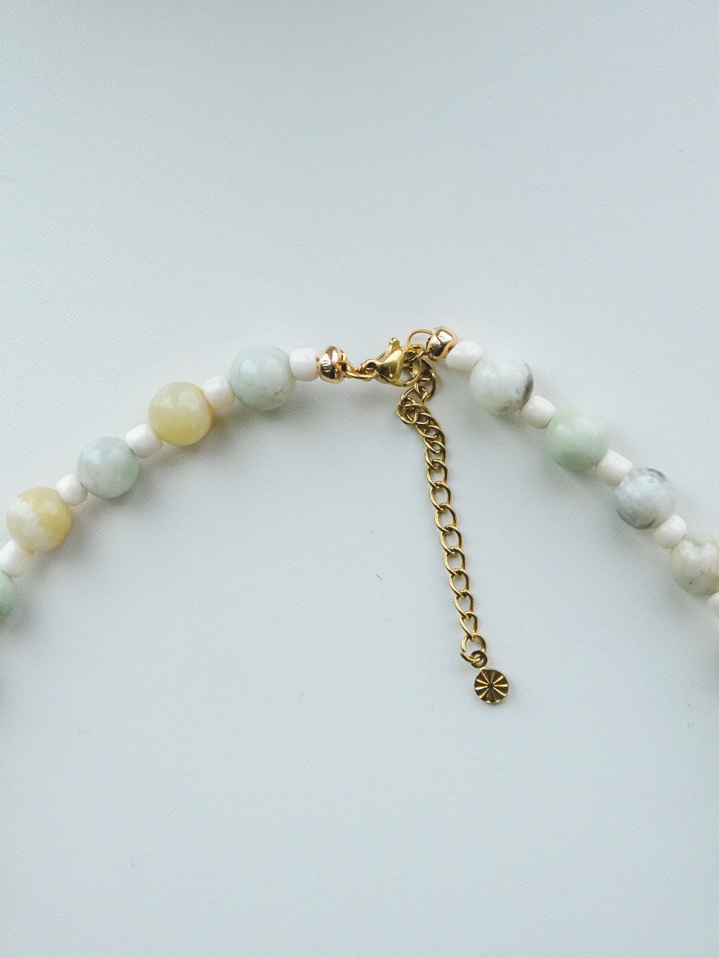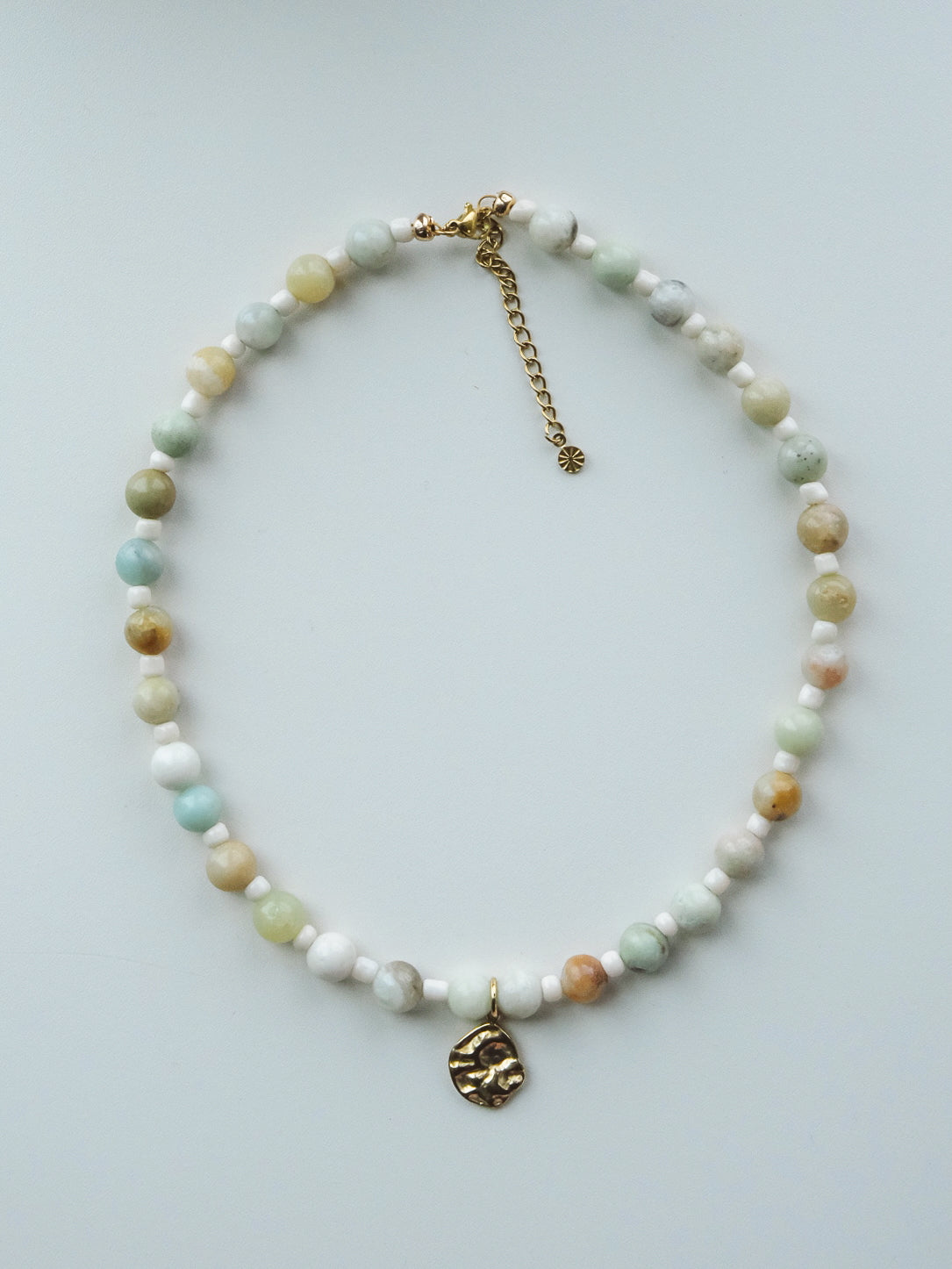 Handgemaakte ketting met natuursteen kralen, afgewerkt met een gouden hanger. Gemaakt van RVS/stainless steel, waardoor de ketting niet verkleurt.